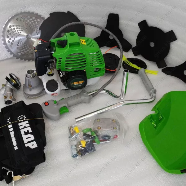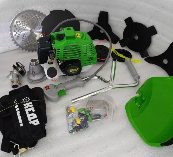 диск 3 лопасти, диск 3 лопасти улучшенный, диск 4 лопасти, диск 8 лопастей, диск победитовый, защитный кожух для ножа или катушки, инструкция, набор ключей, насадка для лески «»паучок», ремень, ручки управления, шпуля с леской