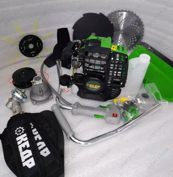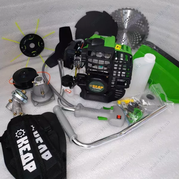 • диск 3 лопасти, диск 8 лопастей, диск победитовый, защитный кожух для ножа или катушки, инструкция, набор ключей, насадка для лески «»паучок», ремень, ручки управления, шпуля с леской