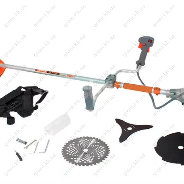 защитный кожух для ножа или катушки, инструкция, мерный бачок, набор ключей, нож 3 лопасти, нож 40 зубов, нож 8 лопастей, ремень, ручки управления, шпуля с леской