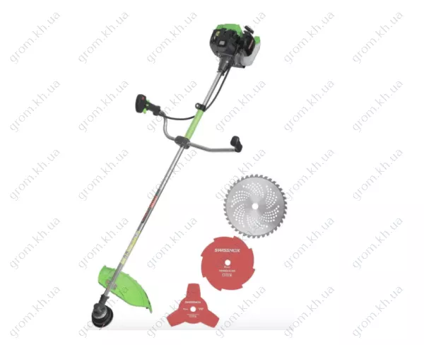 • диск 3 лопасти, диск на 8 лопастей, защитный кожух для ножа или катушки, инструкция, мерный бачок, набор ключей, нож c победитовыми напайками, ремень за 2 плеча, ручки управления