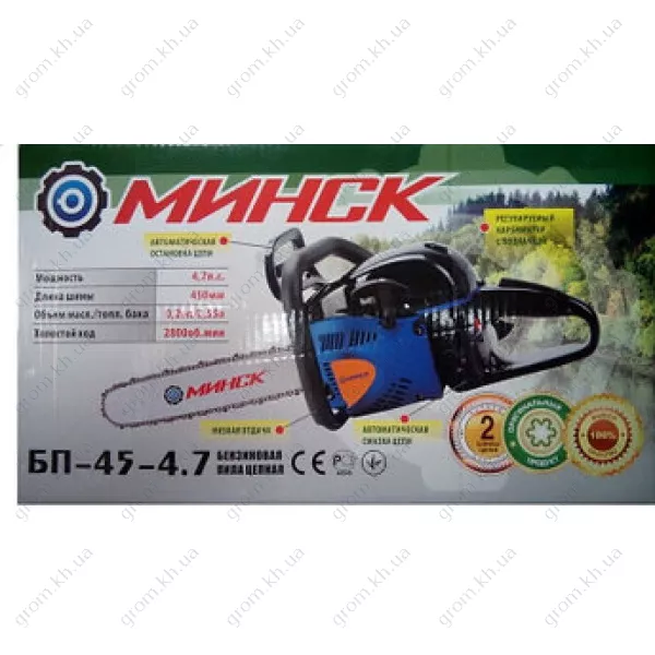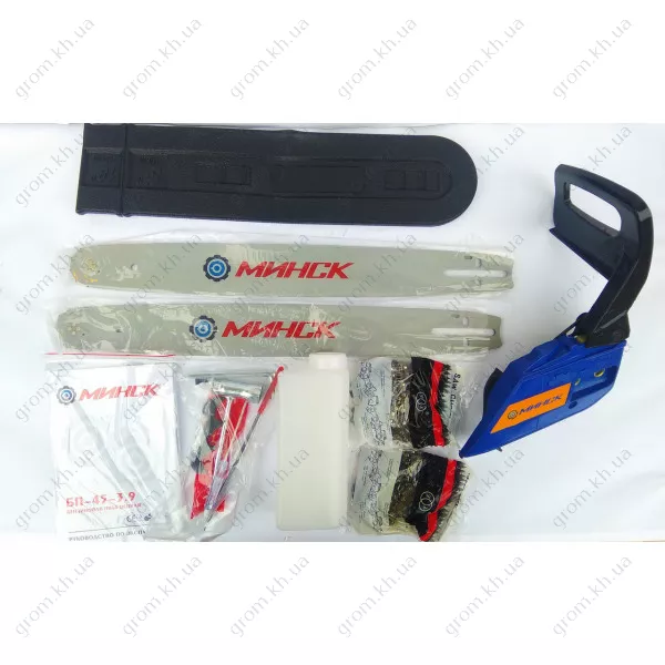 • Бензопила Минск БП-45-4,7, шина ― 2 шт., цепь ― 2 шт., набор ключей, руководство пользователя, ёмкость для смешивания топлива и масла, лейка.