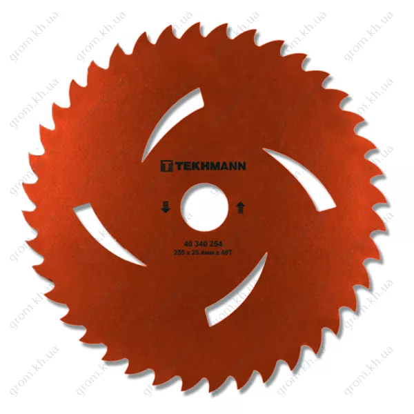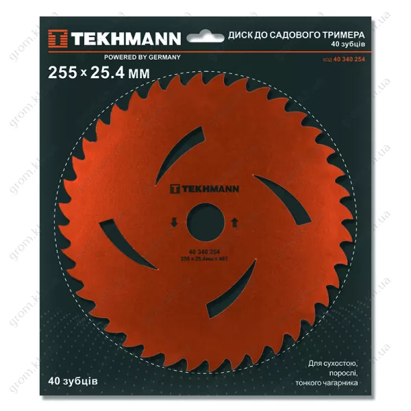 Характеристики Диск с порошковым покрытием к садовому триммеру Tekhmann диаметр 255 мм. Количество зубцов 40 с Т профилем зуба.