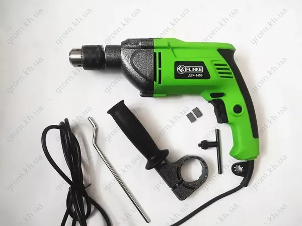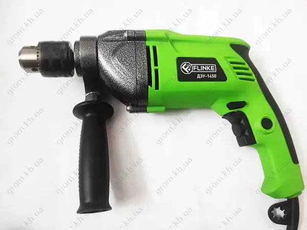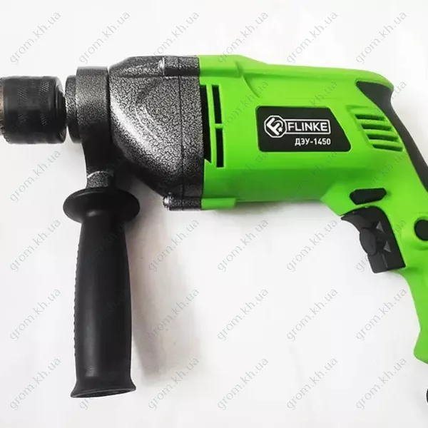 Flinke ДЭУ-1450 оснащен двигателем мощностью 1450 Вт и металлическим ключевым патроном для надежного удержания бит. Он способен работать с различными материалами. Благодаря двухрежимной работе пользователи могут легко переключаться между стандартным сверлением древесины, металла и пластика и ударным сверлением для более твердых материалов, таких как каменная кладка и бетон.