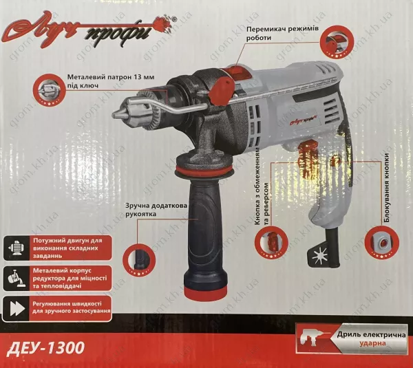 Электрическая дрель ЛУЧ-Профи ДЭУ-1300 – недорогое полупрофессиональное оборудование, которое может использоваться как для бытовых, так и для производственных задач. Оно справляется с металлом, бетоном, кирпичной кладкой (в этих поверхностях сверло может проделывать отверстия диаметром не более 13 мм), а также деревом (в нем можно делать углубления диаметром до 25 мм). Инструмент позволяет выполнять сверление, сверление с ударом, а также заворачивание шурупов.