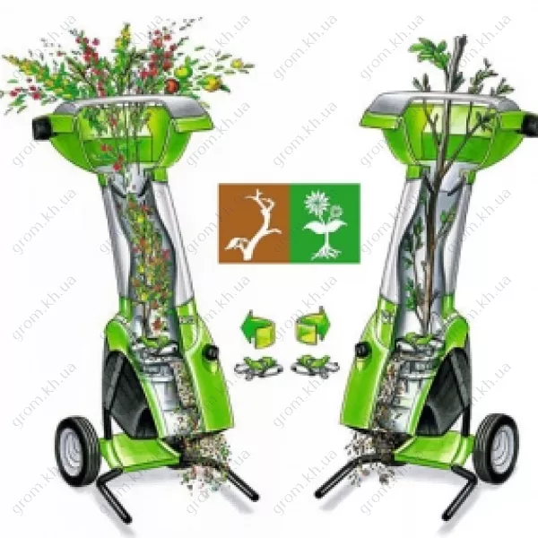 Два загрузочных отверстия: первое в форме трилистника, для ветвистых сучковатых веток; второе широкое и прямоугольное − под мягкие органические отходы (листя, бурьян, жесткая трава и т.д.);