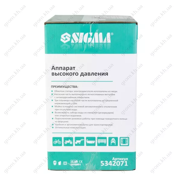 Характеристики Мойка высокого давления SIGMA 1700Вт max 130bar 6.7 л/мин+турбонасадка