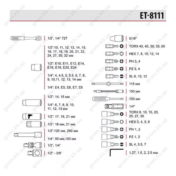 Характеристики Набор инструментов 111 ед. STORM, 1/2", 1/4", Сr-V INTERTOOL ET-8111