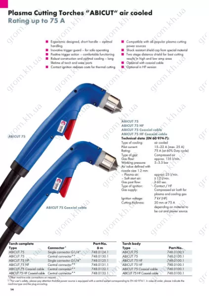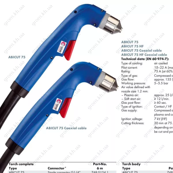 Характеристики Плазмотрон Abicor Binzel ABICUT 75