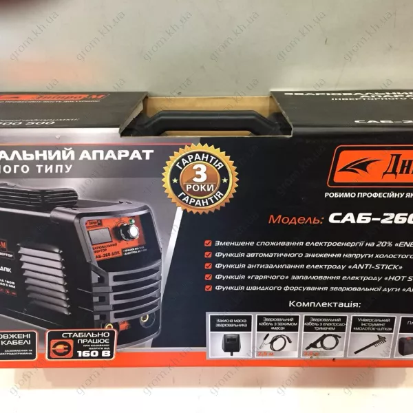 Если вы затеяли ремонт с использованием сварочного аппарата, и не знаете какой аппарат нужен именно вам, то внимательно ознакомьтесь со сварочным аппаратом Днипро – М САБ – 260 ДПК. Это точно то, что вам нужно. Аппарат используется как бытовых, так и в профессиональных целях. Данная модель разработана по новейшим технологиям и предназначена для качественной и эффективной работы с металлом. Оборудование достаточно простое в эксплуатации. Мощность аппарата 6 кВт, что позволяет ему работать со специальными электродами диаметром до 5 мм. Благодаря специальной ручке, расположенной на аппарате, вы легко сможете самостоятельно регулировать силу сварочного тока в диапазоне от 20 до 250 А. Имея компактные размеры и вес всего 3.8 кг аппарат очень просто и легко транспортировать к месту работы. А благодаря специально идущему в комплекте с аппаратом кейсу, вы сможете надежно защитить оборудование во время его транспортировки куда – либо и использовать для хранения аппарата.