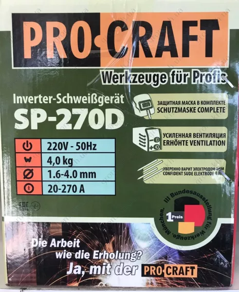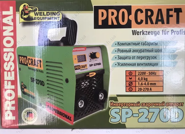 Сварочный инвертор Procraft SP-270D – легкое малогабаритное оборудование, которое может использоваться как в домашних, так и в промышленных условиях. Обеспечивает стабильное высокое качество обработки материала. Эта современная техника является многофункциональной, она может применяться для выполнения таких задач: резки металла, сварки конструкций, наплавки. Агрегат позволяет работать как с постоянным, так и с переменным током, использовать широкий спектр электродов.
