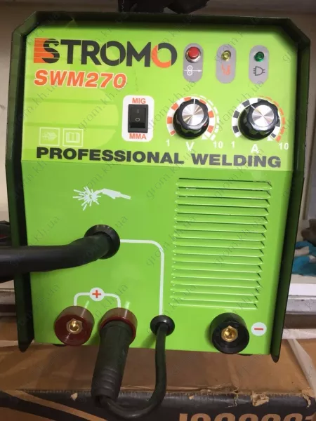 Сварочный полуавтомат STROMO SWM 270(+MMA) пользуется своим авторитетом на рынке сварочного оборудования. Автомат варит проволокой в полуавтоматическом режиме. Этот поляк появился на рынке Украины относительно недавно, но при этом показал себя с лучшей стороны. Пройдясь по характеристикам, мы видим, что аппарат однофазный, скорость подачи проволоки от 2,5 до 13 метров в минуту. Максимально потребляемая мощность 5,5 кВт, КПД-85%. Номинальный режим работы 80 %, работает он от 40 до 300 А, что позволяет варить проволокой диаметром до 1 мм, а электродом до 4 мм. На передней панели мы видим кнопку переключения, кнопка быстрой протяжки, индикатор перегрева, регулировка ампеража и скорость протяжки. Снизу расположены клеммы плюс и минус, а также байонет для смены и варения флюсовой проволокой. Внутри находится пластмассовый механизм, оборудован одной парой роликов, там же расположена бабина для проволоки бухтой до 5 кг. В комплект к данному агрегату идёт: электродержатель 2,2 м, масса 1, 5, щетка - молоток, паспорт, бухта порошковой проволоки диаметром 0,8, гарантия на 12 месяцев. Вес данного аппарата 12 кг. Рукав в этом аппарате идет встроенный и сделанный на совесть. Из бюджетных аппаратов на рынке - это лучший вариант. Такой агрегат вам отлично подойдёт для бытовых нужд. При этом не смущайтесь ценой, качество аппарата действительно на практике удивляет.