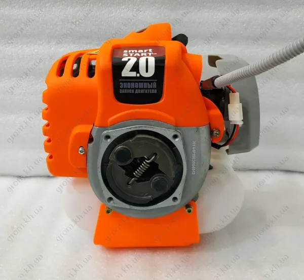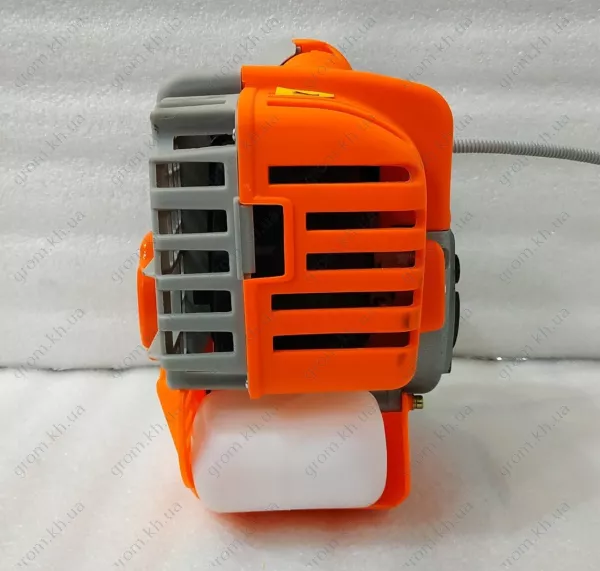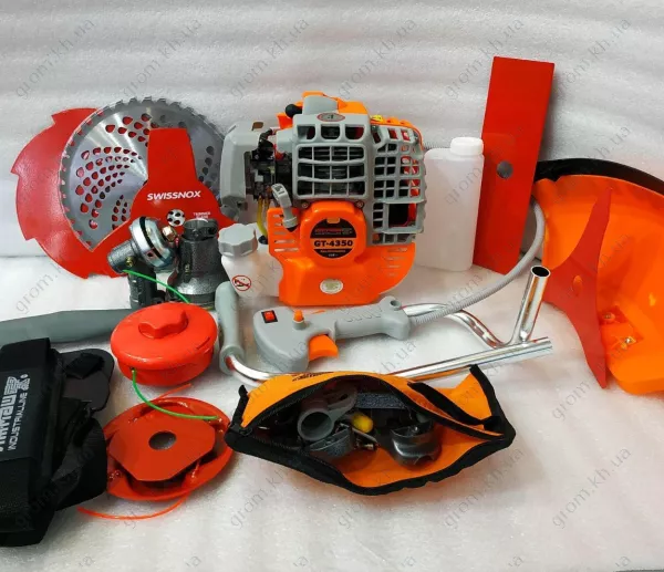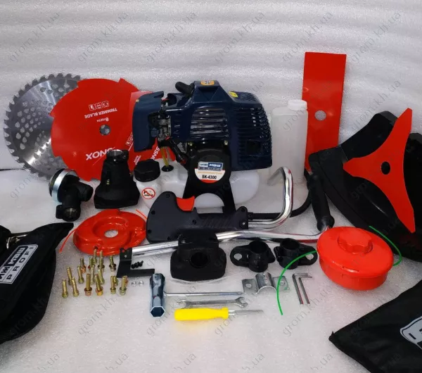 Бензоксу. свічковий ключ, керуюча рукоятка, 6-ти грані ключі для складання, ремінь на плече, мірний бачок для змішування бензину з маслом, інструкція з експлуатації, оригінальна картонна упаковка, котушка з ліскою металева-павук, 2-х лопатевий ніж