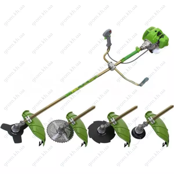 велосипедна рукоятка, якісний карбюратор, металевий цільний вал розрахований на великі навантаження, низький рівень шуму та вібрації, подача волосіні - напівавтоматична, посилена поршнева група