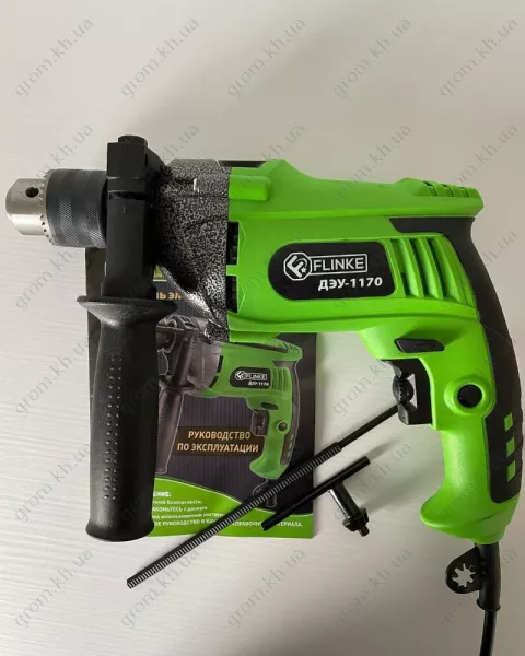 Дриль електричний ударний Flinke ДЕУ-1170, виконаний у корпусі з АБС-пластику, поєднує в собі легкий дизайн і довговічність, забезпечуючи зручне захоплення та тривалу роботу. Редуктор із високоміцного сплаву та металевий ключовий патрон підкреслюють міцну конструкцію інструменту, готову витримати найсуворіші умови свердління.