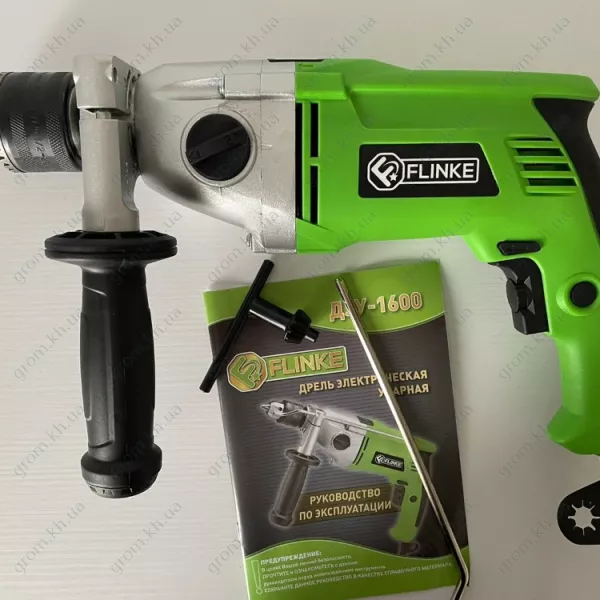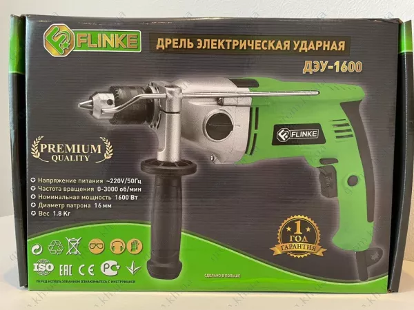 Розроблений з урахуванням універсальності, Flinke ДЕУ-1600 працює від стандартного джерела живлення 220 В і оснащений потужним двигуном потужністю 1600 Вт, що забезпечує потужність, необхідну як для точного свердління, так і ударного проникнення в різні матеріали.