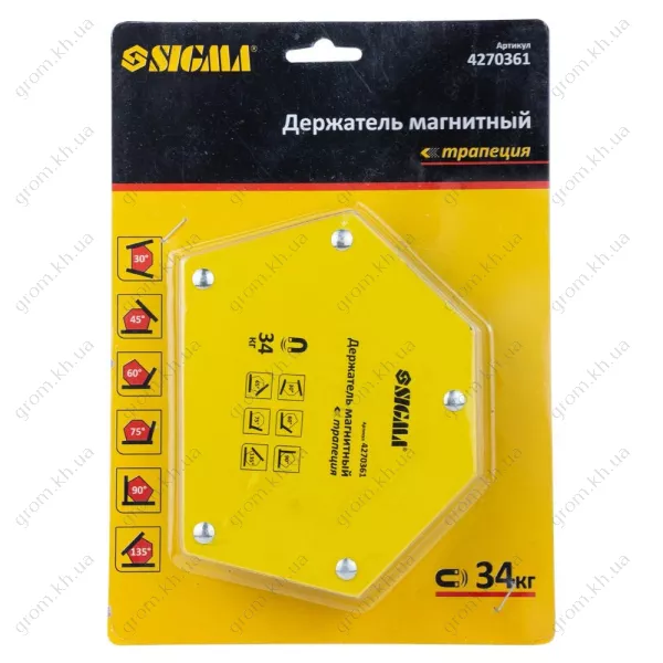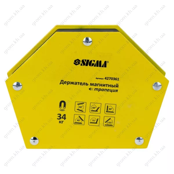 Характеристики Магніт для зварювання трапеція SIGMA 34кг 105×65×65×45мм (30,45,60,75,90,135°)