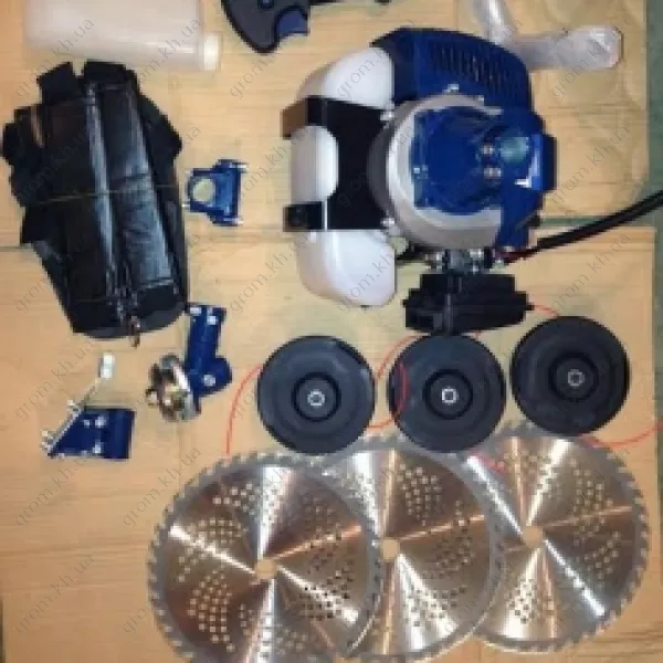 Бензокоса Дніпро ДБТ-4300, коробка, інструкція (паспорт), 40-ка зубчаста фреза з переможною напайкою 3-шт., котушка з ліскою 3-шт., мірний бачок для змішування бензину з маслом, лійка, велосипедна рукоятка з органами управління, набір ключів, плечовий ремінь. ~
