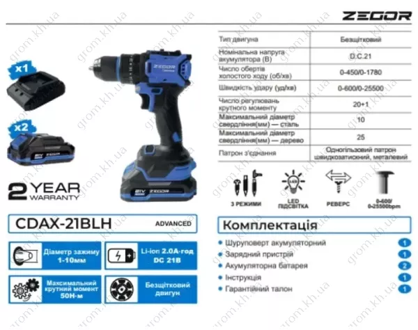 Характеристики Шуруповерт акумуляторний безщітковий ZEGOR CDAX-21BL
