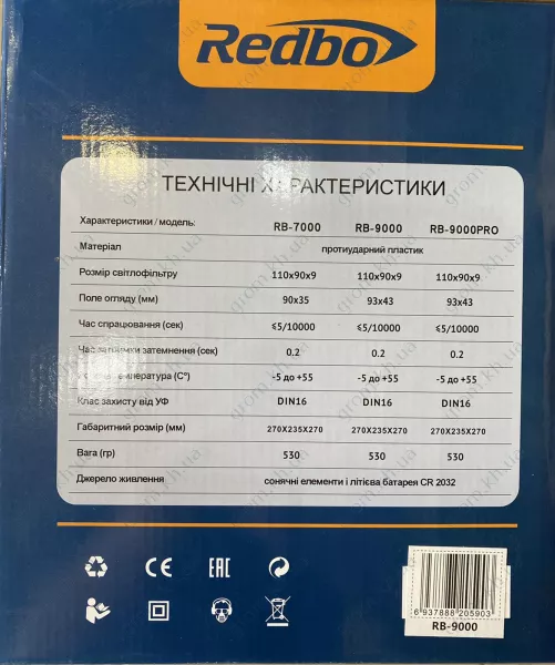Зварювальна маска хамелеон Redbo RB-9000 – новий захисний пристрій, який дозволяє захистити очі, шкіру обличчя та шиї під час виконання дугового зварювання та робіт у середовищі аргону. Має максимальний ступінь захисту 16 DIN. Швидкість затемнення становить 40 мікросекунд. Маска дає хороший огляд, її не потрібно знімати або піднімати для виконання дрібних робіт, не пов'язаних безпосередньо зі зварюванням (видалення шлаку, заміна заготовок).
