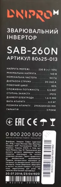Характеристики Зварювальний інвертор Дніпро-М SAB-260N