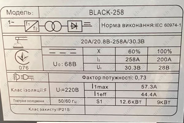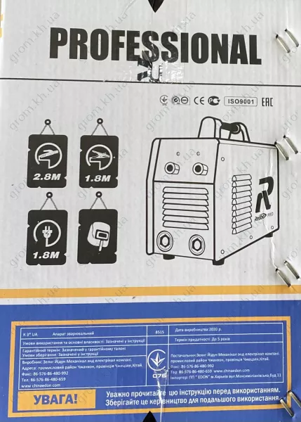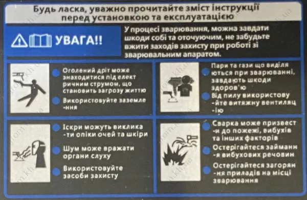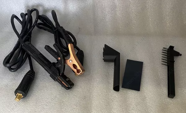 Пристрій супроводжується всіма необхідними для роботи аксесуарами. У комплекті до нього ви знайдете захисний щиток, молоток для видалення шлаку, кабелі маси та електрода, детальну інструкцію з експлуатації та офіційний гарантійний талон.