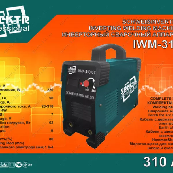 - Зварювальний інвертор Spektr IWM ММА 310 IGBT пластик з електронним табло SI, кабелю (на масу + електроутримувач), затискач маси, щітка-молоток, захисний щиток, інструкція з експлуатації.