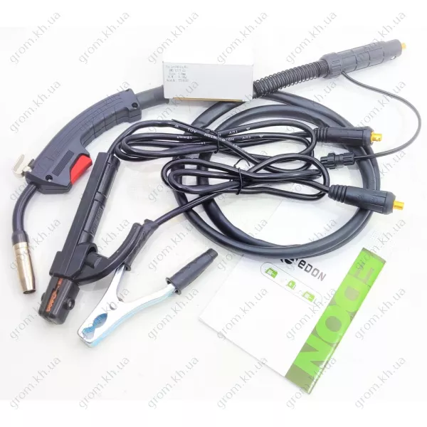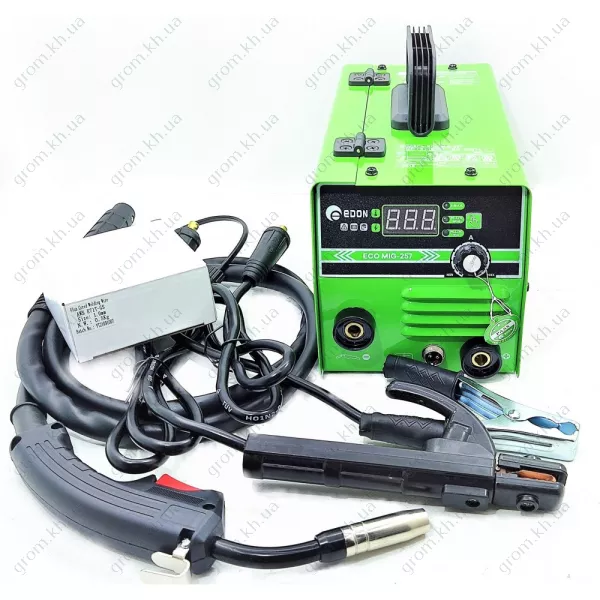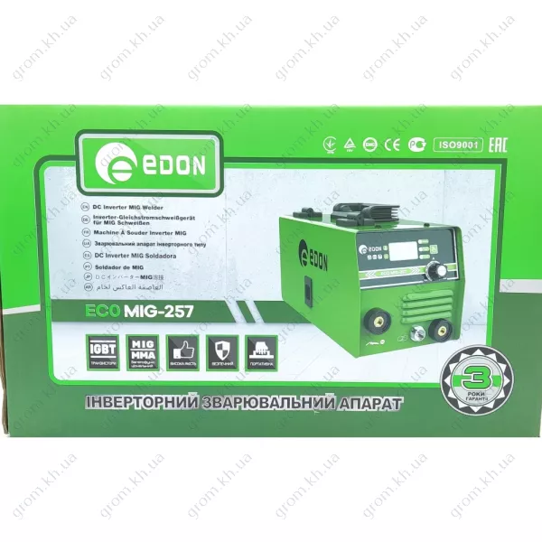У комплект поставки напівавтомата Edon ECO MIG-257 входить гарантія 36 місяців, зварювальний шланг, кабелі із заземлюючим затискачем та електродотримачем, щітко-молоток, захисна маска, зварювальний дріт діаметром 1,0 мм (0,5 кг), шнур довжиною 3 м. газовий шланг, що подає ролик 08-1.0, а також посібник з експлуатації та гарантійний талон.