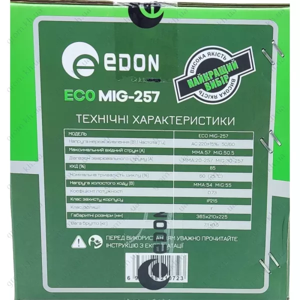 Працюючи при напрузі 220 В та частоті 50 Гц, Edon ECO MIG-257 забезпечує діапазон зварювального струму від мінімум 30 А до максимум 257 А. Цей зварювальний апарат працює з дротом діаметром від 0,6 мм до 1,0 мм та електродами діаметром від 1,6 мм До 3 мм, що забезпечує гнучкість при виконанні різних зварювальних робіт.